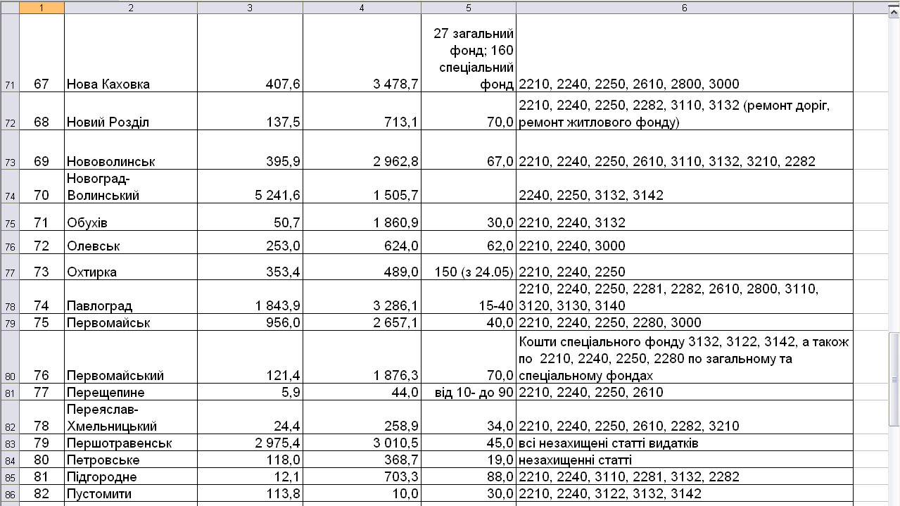 Обсяг заблокованих коштів, зокрема, Одеси склав більше 89,3 млн грн, Запоріжжя - 62,9 млн грн., Львова - 41,8 млн грн., Луганська - 34,44 млн грн., Миколаєва - 34,35 млн грн., Сімферополя - 29,3 млн грн., Кіровограда - 27,9 млн грн., Чернігова - 26,4 млн грн., Житомира - 26,3 млн грн., Херсона - 24,1 млн грн., Хмельницького - 23, 1 млн грн., Сум - 20,9 млн грн., Івано-Франківська - 17,68 млн. грн., Чернівців - 16 млн грн., Вінниці - 13,6 млн грн., Тернополя - 13,4 млн грн., Черкас - 12,3 млн грн., Ужгорода - 7,45 млн грн. (детальніше - див. табл. 1).