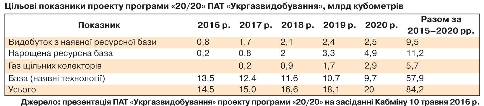 До 2020 р. в рамках програми "20/20", яку у травні "Укргазвидобування" презентувала Кабміну, на нові родовища планується витратити 84,5 млрд грн, що дасть сумарно приріст річного видобутку в 10 млрд кубометрів газу і 26 млрд накопиченого видобутку.