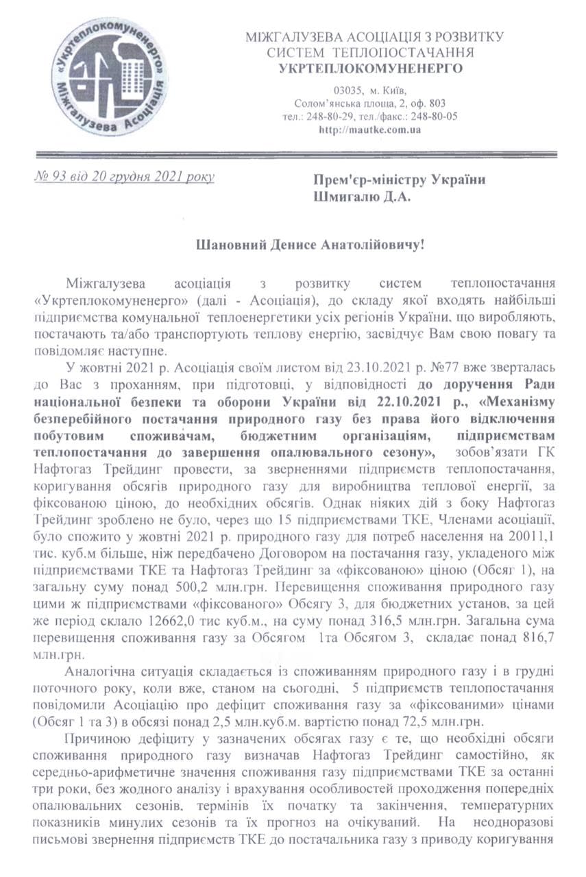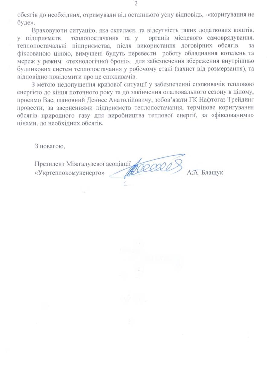 Асоціація звернулась до прем'єр-міністра України Шмигалю з проханням унеможливити кризу: «З метою недопущення кризової ситуації у забезпеченні споживачів тепловою енергією до кінця поточного року та до закінчення опалювального сезону в цілому, просимо Вас, шановний Денисе Анатолійовичу, зобов’язати ГК Нафтогаз Трейдинг провести, за зверненнями підприємств теплопостачання, термінове коригування обсягів природного газу для виробництва теплової енергії, за «фіксованими» цінами, до необхідних обсягів».