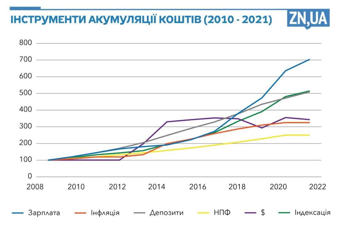 Так, при акумульованій інфляції за ці роки в 3,25 разу вкладення в недержавні пенсійні фонди очікувано показали найгірший результат, який навіть не покриває рівня інфляції, — 2,5. Проста заміна гривні на валюту примножила номінальні кошти в 3,43 разу. Банківський депозит дав змогу акумулювати кошти на рівні 5,09. За цей час середня зарплата зросла в 7,01 разу. А саме її закладено в розрахунки пенсії, саме тому добровільні внески досі найкращий спосіб заощадження на старість.