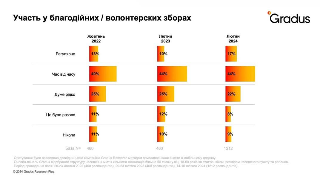 Опитування свідчать, що збільшується регулярності донатів від громадян. А частка тих, хто долучається до благодійних чи волонтерських зборів час від часу, не змінилась з лютого 2023 року і залишається на рівні 44%.