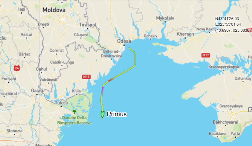 Балкер PRIMUS сінгапурського оператора під прапором Ліберії, який вийшов з Одеського порту 26 серпня, покинув територіальні води України, ставши другим судном, яке покинуло український чорноморський порт після виходу Росії з зернової угоди та початку ескалації у Чорному морі у липні. За даними сервісу MarineTraffic станом на вечір 27 серпня, корабель знаходиться неподалік румунського берега.