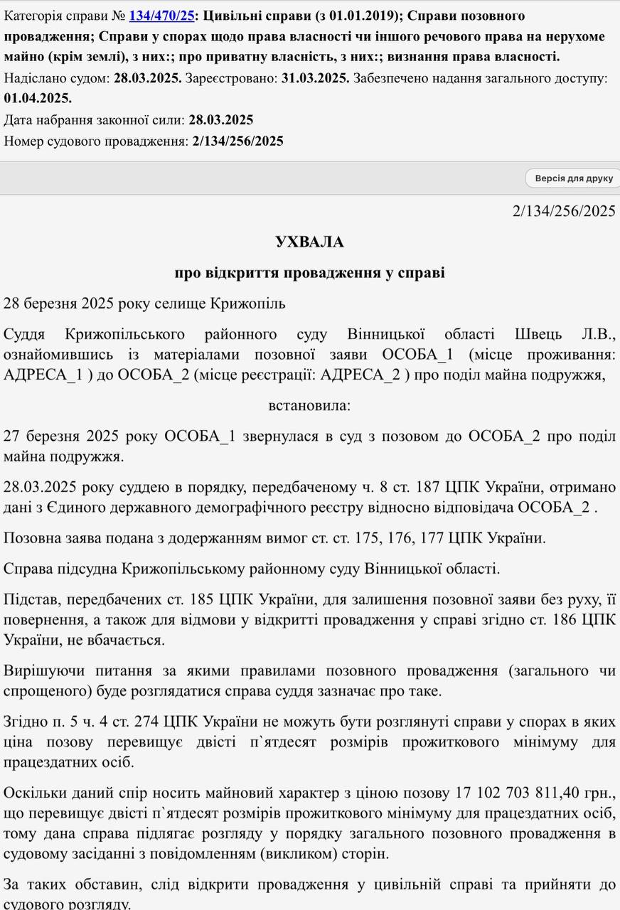 Дружина пʼятого президента України, народного депутата та лідера “Європейської солідарності” Петра Порошенка Марина Порошенко наприкінці березня поточного року подала до суду позов щодо поділу майна подружжя. Позов було подано Крижопільському районному суду Вінницької області. Про це свідчать дані судових матеріалів.