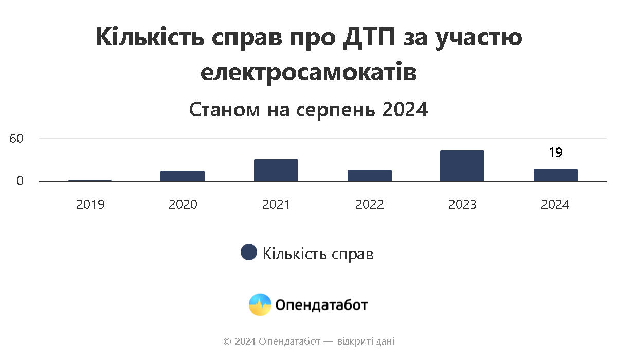 Зазначається, що станом на серпень 2024 року 111 адміністративних та 22 кримінальні справи через ДТП з електросамокатами виявлено в судовому реєстрі.