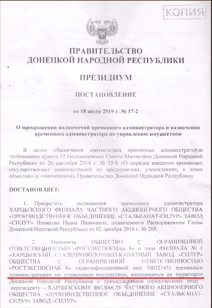 Відомо, що канатний завод "Силур" передано "в управління" російському ТОВ "РосЕкспоСнаб", Горлівський м'ясокомбінат - ТОВ "Профгарант", відкритої інформації про обидві фірми майже немає.