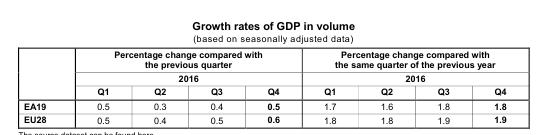 Сумарний ВВП 28 країн Європейського Союзу в 2016 році зріс на 1,9%, обсяг ВВП 19 країн, що входять в єврозону, збільшився на 1,7%, свідчать попередні дані Євростату.