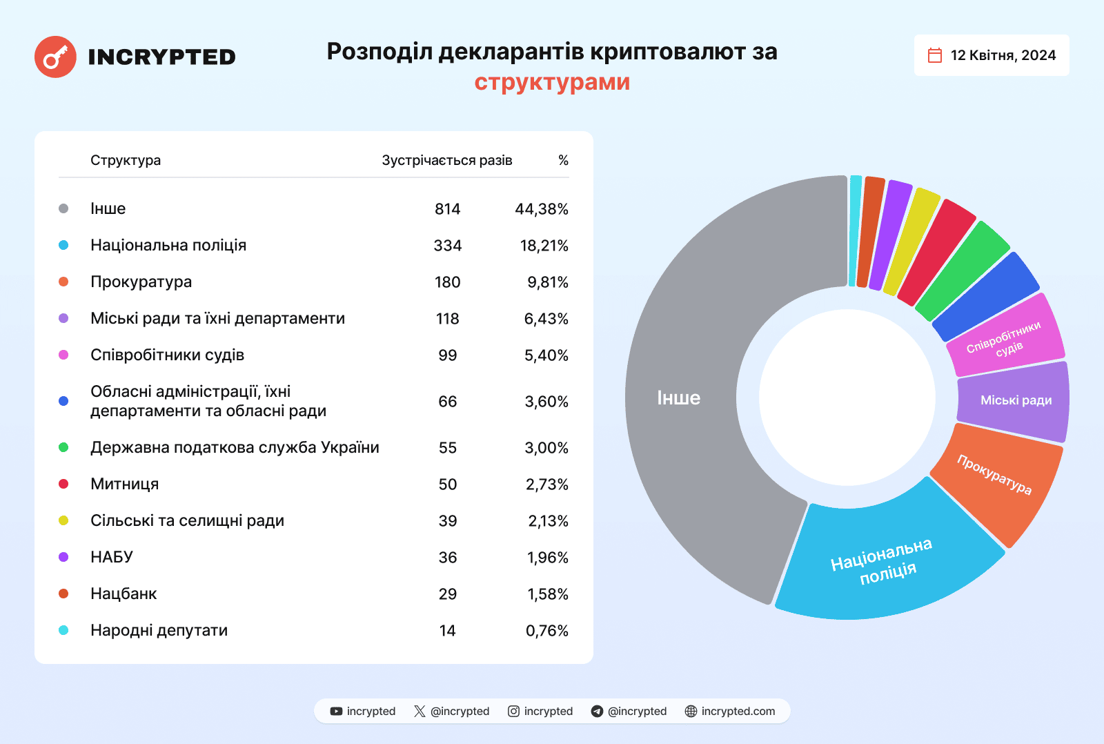 В органах місцевого самоврядування цифрові активи теж мають популярність, але значно менше. Тут в цілому накопичили за офіційними деклараціями 36 біткоїнів, 240 етеріумів та приблизно 128 000 USDT.
