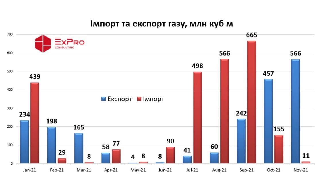 Експорт газу у листопаді істотно перевищив аналогічний жовтневий показник – 566 млн куб м, на 24% (109 млн) більше. А у порівнянні з листопадом 2020 року експорт взагалі зріс у 3,7 разів. Про це пише видання ExPro з посиланням на данні ТОВ «Оператор ГТС України» (ОГТСУ).