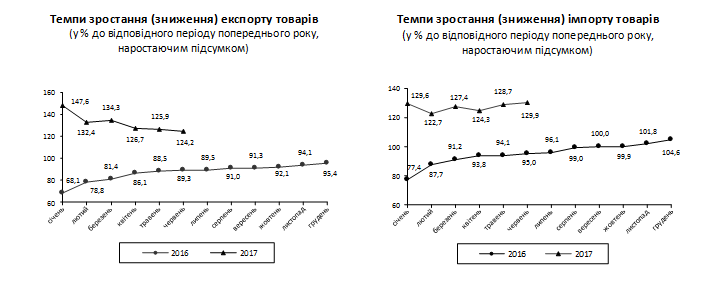 В цілому експорт українських товарів за перше півріччя збільшився на 24,2%, склавши $ 20,6 млрд. При цьому спостерігається падіння експорту в Китай (на 17,7%) і зростання в Росію (на 26,4%) і Білорусь (на 40,7%).