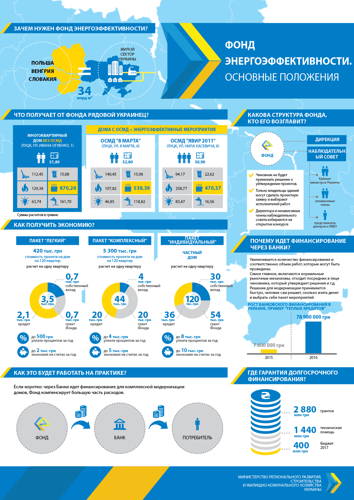 "З 1000 грн економія може сягнути 600 грн, які, за потреби, щомісяця перераховуватимуться на виплату кредиту, а Фонд надасть допомогу в розмірі 20-50% загальної вартості проекту, що ще зменшить навантаження на відповідального домовласника, котрий проведе модернізацію. Цих коштів буде достатньо, аби скористатися практично безвідсотковим банківським кредитом на термомодернізацію", - роз'яснює він.