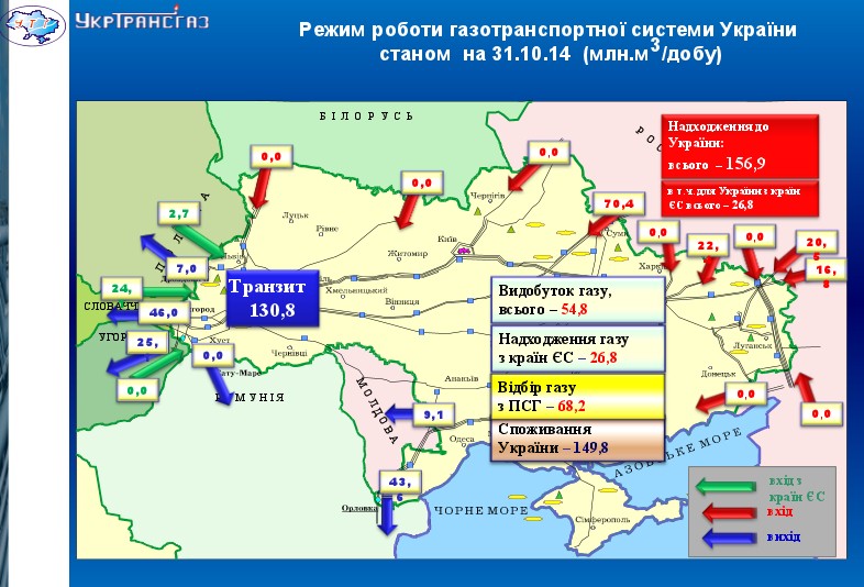 Станом на 31 жовтня через газотранспортну систему України в Європу проходить транзитом 130,8 млн кубометрів російського газу на добу. Україна ж отримує 26,8 млн кубометрів газу на добу за реверсним напрямком з країн ЄС.