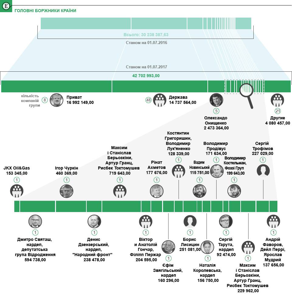 Найбільший борг утворився у "Укрнафти", якою володіє держава разом з групою "Приват" Ігоря Коломойського і Геннадія Боголюбова. НАК "Нафтогаз України" належить 50%+1 акція підприємства, в той час як групі "Приват" – близько 42 % акцій. Борг "Укрнафти" перед державою перевищує 13,2 млрд грн – за останній рік він зріс на 2,5 млрд грн.