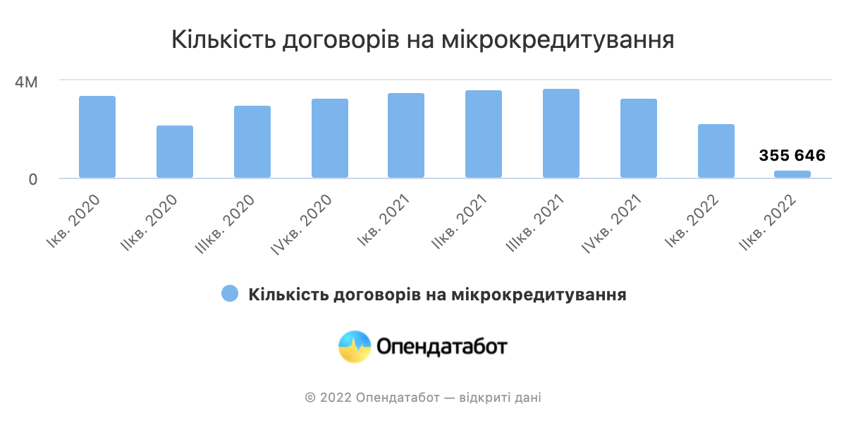 Так, сума позик, наданих мікрофінансовими організаціями, впала до 1,3 млрд гривень у другому кварталі поточного року. Це у понад 12 разів менше, аніж середня сума мікрокредитування за квартал торік — 16,2 млрд гривень.