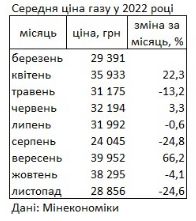 Мінекономіки оприлюднило середню ціну природного газу, яка була актуальна в листопаді поточного року. Ресурс за місяць подешевшав на 24,6%, його вартість становила 28 855,75 гривень за 1 тис. кубометрів без ПДВ. Про це свідчать дані міністерства.