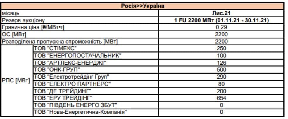 За даними компанії, на листопад доступ до перетину з РФ отримали 8 компаній. Зазначається, що загалом було запропоновано 2200 МВт. По результатах аукціону, найбільше отримали "ЕРУ Трейдінг" та "Онк Груп" – 654 МВт та 500 МВт.