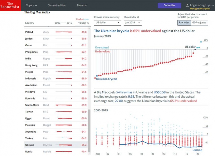 Видання The Economist оприлюднило щорічні дані за рейтингом світових валют щодо індексу Біг-Мака. Згідно з результатами, вартість гривні недооцінена на 65,2%, а реальний курс щодо купівельної спроможності повинен бути в розмірі 9,68 гривні за долар.