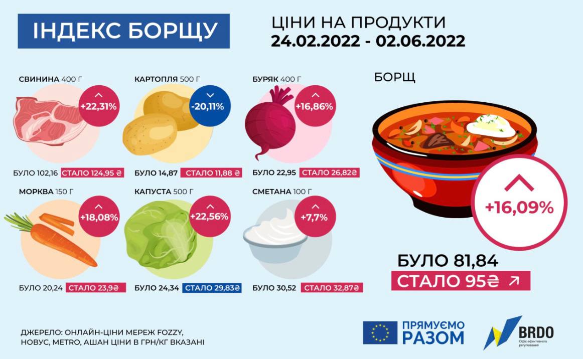 Відповідно до аналізу, на 3 червня порція борщу на чотирьох осіб коштує 95 гривень, тоді як 24 лютого - 81,84 грн.