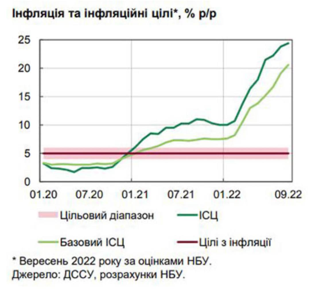 За офіційними оцінками Нацбанку, споживча інфляція в Україні пришвидшується. Зростання у цін у річному вимірі прискорилося з 23,8% у серпні до 24,4% у вересні. Про це свідчать останні дані Макроекономічного та монетарного огляду НБУ (жовтень 2022 року).