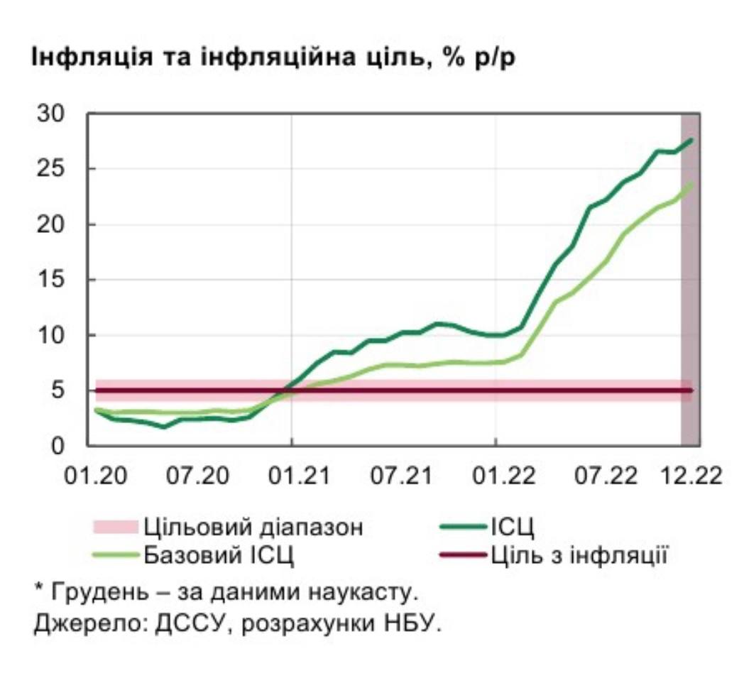 НБУ не наводить цифру інфляції за 2022 рік, однак з оприлюдненого графіку видно, що за оцінками центробанку вона становила близько 27,5%.