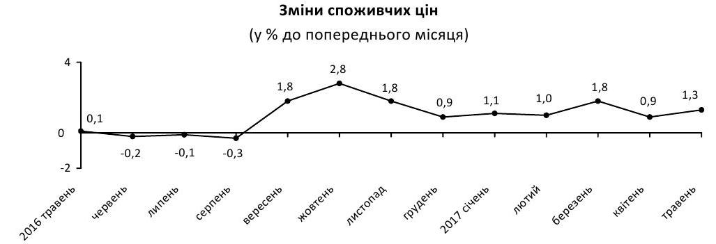 Споживчі ціни в Україні в травні 2017 року порівняно з квітнем зросли на 1,3%, повідомляє Державна служба статистики.