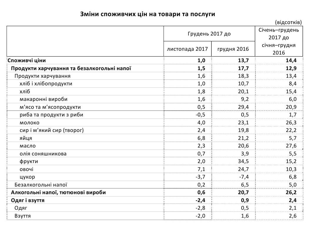 За даними статистичного відомства, продукти в Україні за 2017 рік подорожчали на 18,3% Більше всього подорожчали фрукти – на 34,5% і м'ясо – на 29,4%. Цукор подешевшав на 7,4%.
