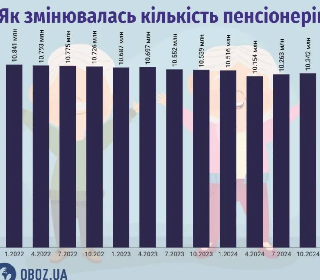 Відповідно даних ПФ, станом на вересень пенсії отримують 10 млн 342 тис. осіб. Для порівнння, в січні 2022-го кількість пенсіонерів була на рівні 10 млн 841 тис. З січня 2020-го до січня 2022-го, їх кількість знизилась на 493 тис. осіб. Тобто до повномасштабної війни щомісячно на 20,5 тис. осіб ставало менше.