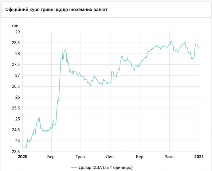 Офіційний курс гривні до долара за 2020 календарний рік знизився на 19,3% з 23,69 грн 1 січня 2020 року до 28,27 грн 31 грудня 2020 року. Про це пише ЕП з посиланням на дані сайту Нацбанку.