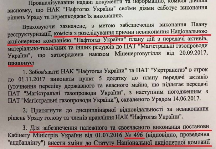 Цим документом прописана передача активів підконтрольного "Нафтогазу" "Укртрансгаз" незалежним від нього держкомпаніям ПАТ "Магістральні газопроводи України" (до її відання повинна була бути передана трубопровідна інфраструктура) та ПАТ "Підземні сховища газу" (передані підземні газосховища).