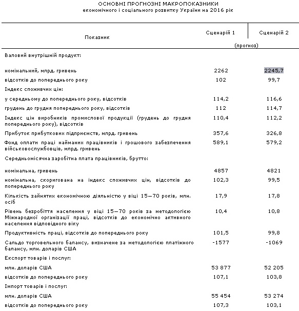 Економіка України в 2016 році зросте на 2% у разі оптимістичного сценарію розвитку, однак за песимістичним сценарієм можливий спад ВВП на 0,3%, йдеться у затверджених Кабміном основних прогнозних макропоказниках на 2016-2019 роки.