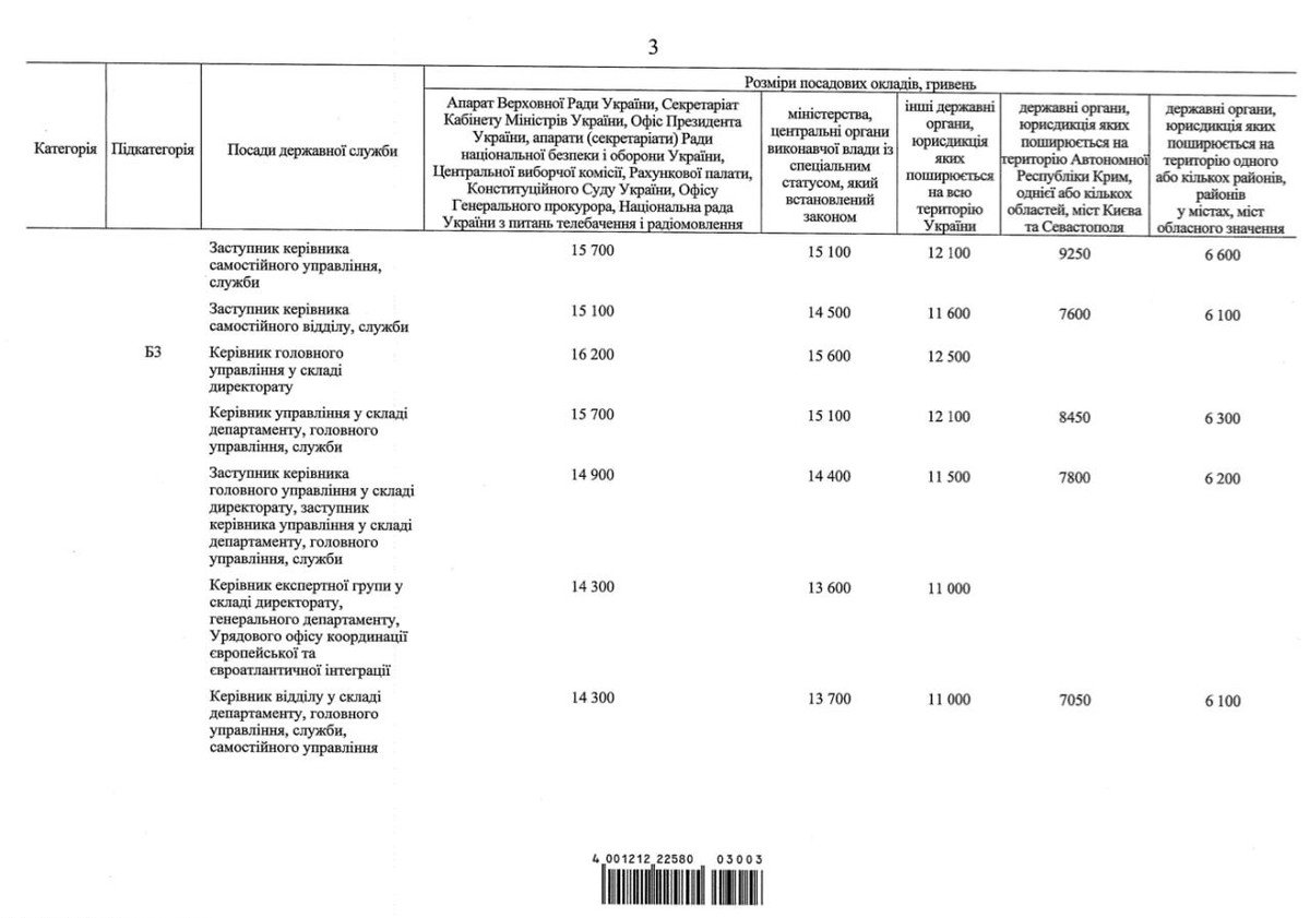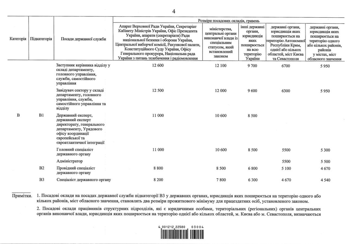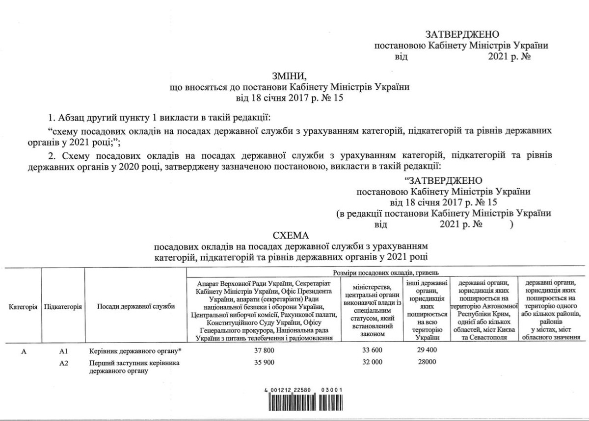 Як наголошується в пояснювальній записці до проекту постанови, мінімальний розмір посадового окладу не може бути менше двох розмірів прожиткового мінімуму для працездатних осіб, встановленого законом. Оскільки прожитковий мінімум з 1 січня 2021 становить 2270 гривень, фахівець державного органу буде отримувати не менше 4540 гривень на місяць. Постановою затверджено «Схема посадових окладів на посадах державної служби з урахуванням категорій, підкатегорій і рівнів державних органів у 2020 році».