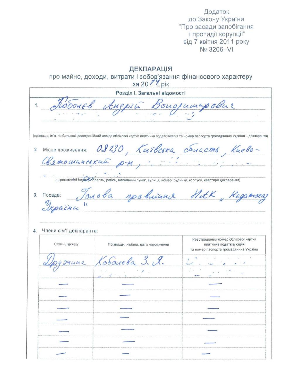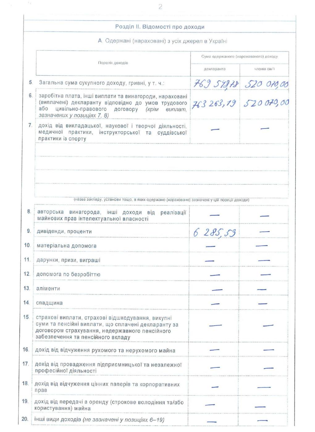 Згідно з документом, практично весь дохід Коболєва складається із зарплати та інших виплат у рамках трудового договору - 763,263 тис. грн. Ще 6,286 тис. грн - дивіденди і відсотки.