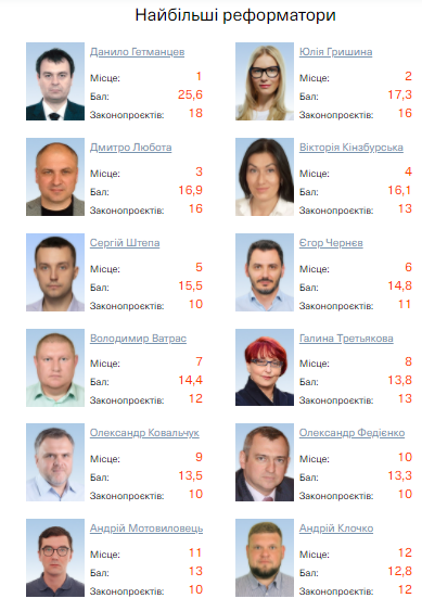Загалом, найбільші бали — від 25,6 до 12,8 бала — отримали 12 народних депутатів. Це Данило Гетманцев (отримав 25,6 бала за роботу над 18 законопроєктами), Юлія Гришина (отримала 17,3 бала за участь в розробці 16 законопроєктів), Дмитро Любота (отримав 16,9 бала за 16 законопроєктів), Вікторія Кінзбурська (16,1 бала за 13 законопроєктів), Сергій Штепа (15,5 балів за 10 законопроєктів), Єгор Чернєв (14,8 бала за 11 законопроєктів), Володимир Ватрас (14,4 бала за 12 законопроєктів), Галина Третьякова (13,8 бала за 13 законопроєктів), Олександр Ковальчук (13,5 балів за 10 законопроєктів) Олександр Федієнко (13,3 бала за 10 законопроєктів), Андрій Мотовиловець (13 балів за 10 законопроєктів) та Андрій Клочко (12,8 бала за 12 законопроєктів). Всі вони є депутатами фракції "Слуга народу".