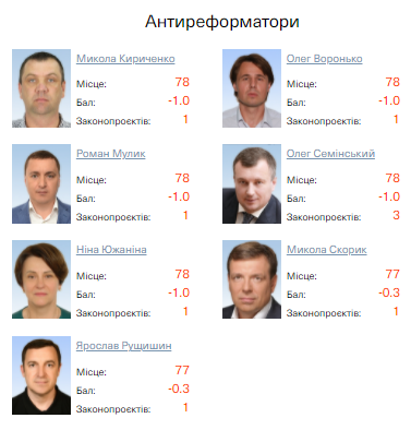 Серед 7 депутатів-антиреформаторів (що потрапили у рейтинг з негативною оцінкою від -0,3 до -1 бала) 6 чоловіків — Ярослав Рущишин, Микола Скорик, Олег Воронько, Микола Кириченко, Роман Мулик та Олег Семінський, та одна жінка — Ніна Южаніна. Вони представляють фракції "Слуга Народу", "Голос", "Європейська солідарність" та ОПЗЖ.