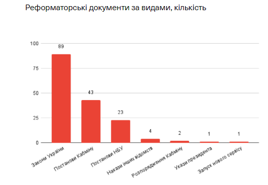 У 2021 році експерти Індексу реформ зафіксували 163 нормативні акти, які мають значний вплив на економічні "правила гри" в Україні. З них 146 отримали позитивну оцінку, дванадцять — нуль балів, а ще п’ять виявилися антиреформами.