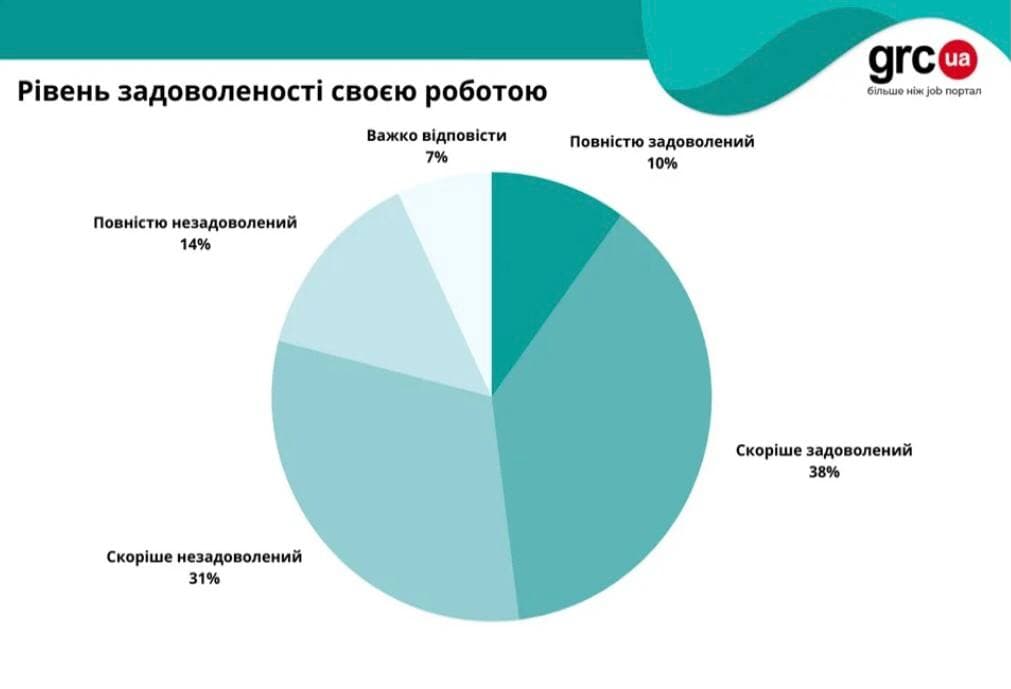 Згідно з дослідженням, з усіх, хто задоволений роботою (з 48%), повністю задоволені – 10%, швидше задоволені – 38%. Проте 45% своєю роботою незадоволені: 14% повністю, 31% – швидше за незадоволені.