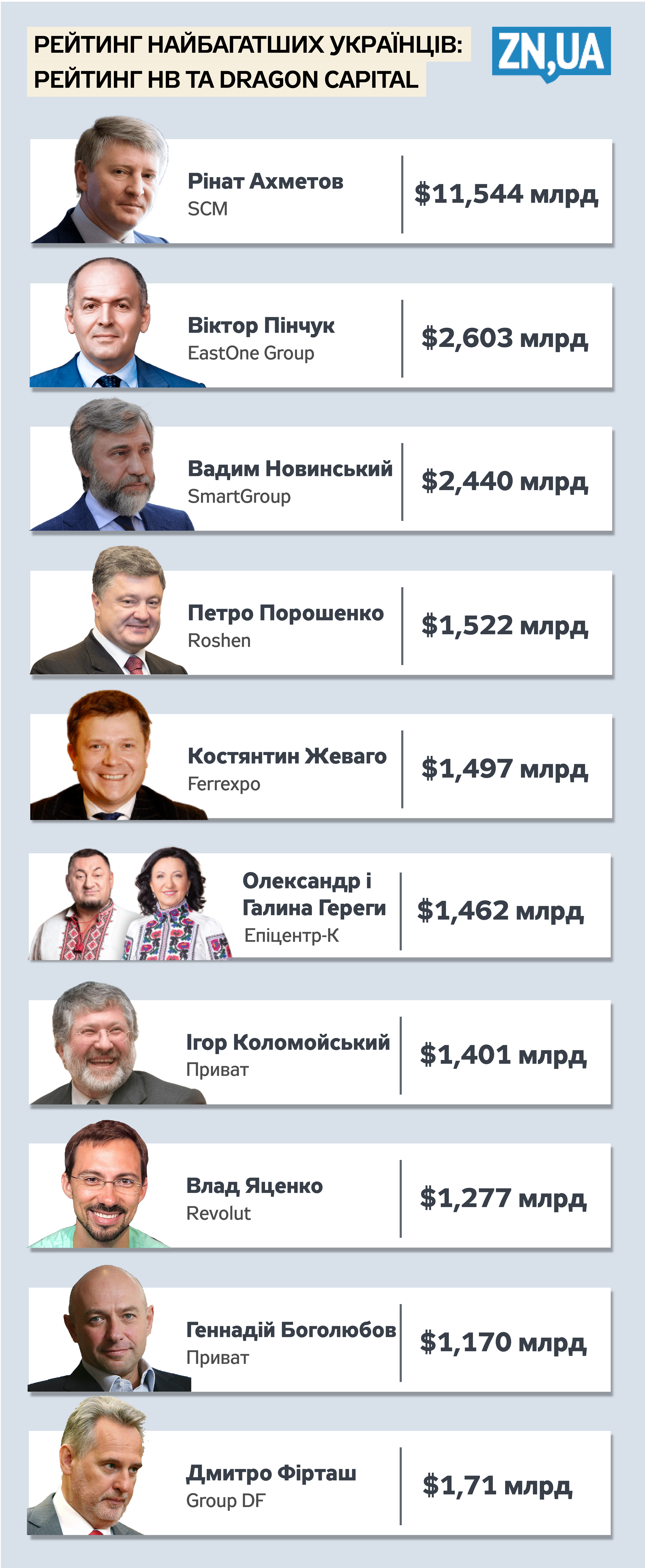 Власник SСM Рінат Ахметов, як і раніше, залишається найбагатшим українцем і зміг наростити свої статки за рік на 75% – до $11,544 млрд. Віктор Пінчук, EastOne Group, зберіг другий рядок з $2,603 млрд (+8%), а на 3- е місце з 5-го піднявся партнер Ахметова з гірничо-металургійної групи "Метінвест" Вадим Новинський, активи якого об'єднані в Smart Group: його статки майже подвоїлися і досягли $2,44 млрд.
