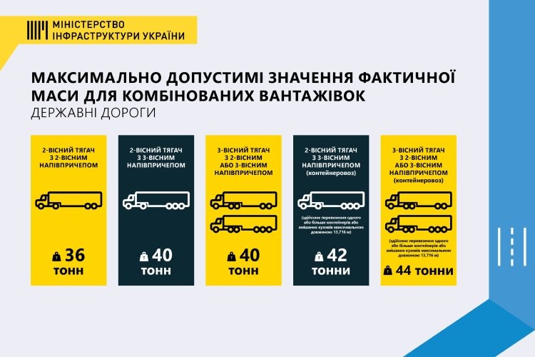Крім того, встановлено максимальну фактичну вагу для тягачів із напівпричепами. Для двоосьового вантажного автомобіля з 2-осьовим причепом - 36 тонн, для тривісного тягача з 2-х або 3-вісним напівпричепом - 40 тонн, для контейнеровозу - 44 тонни.
