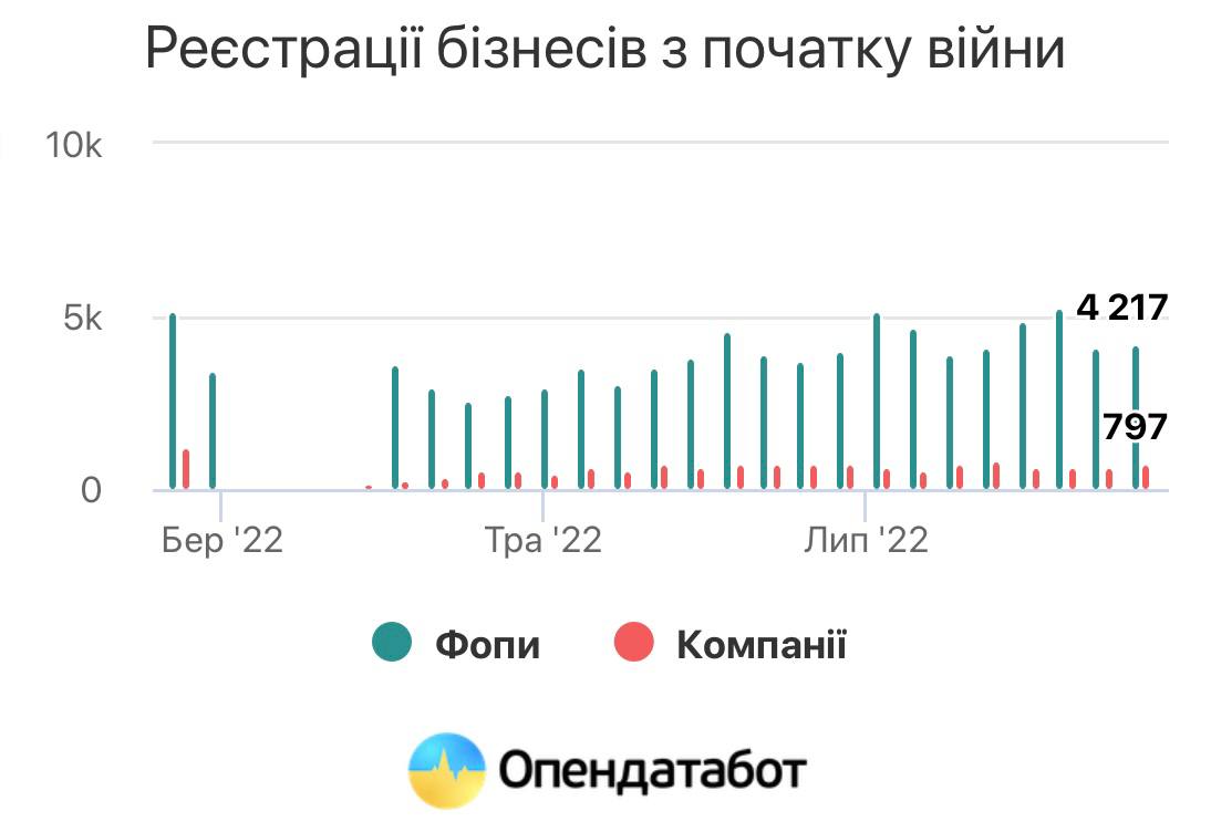 Відповідно до даних платформи, найбільше було зафіксовано у перший тиждень серпня – 5 306 нових ФОПів. Це навіть трохи більше, аніж було в останній тиждень до вторгнення РФ – 5 231 новий ФОП.