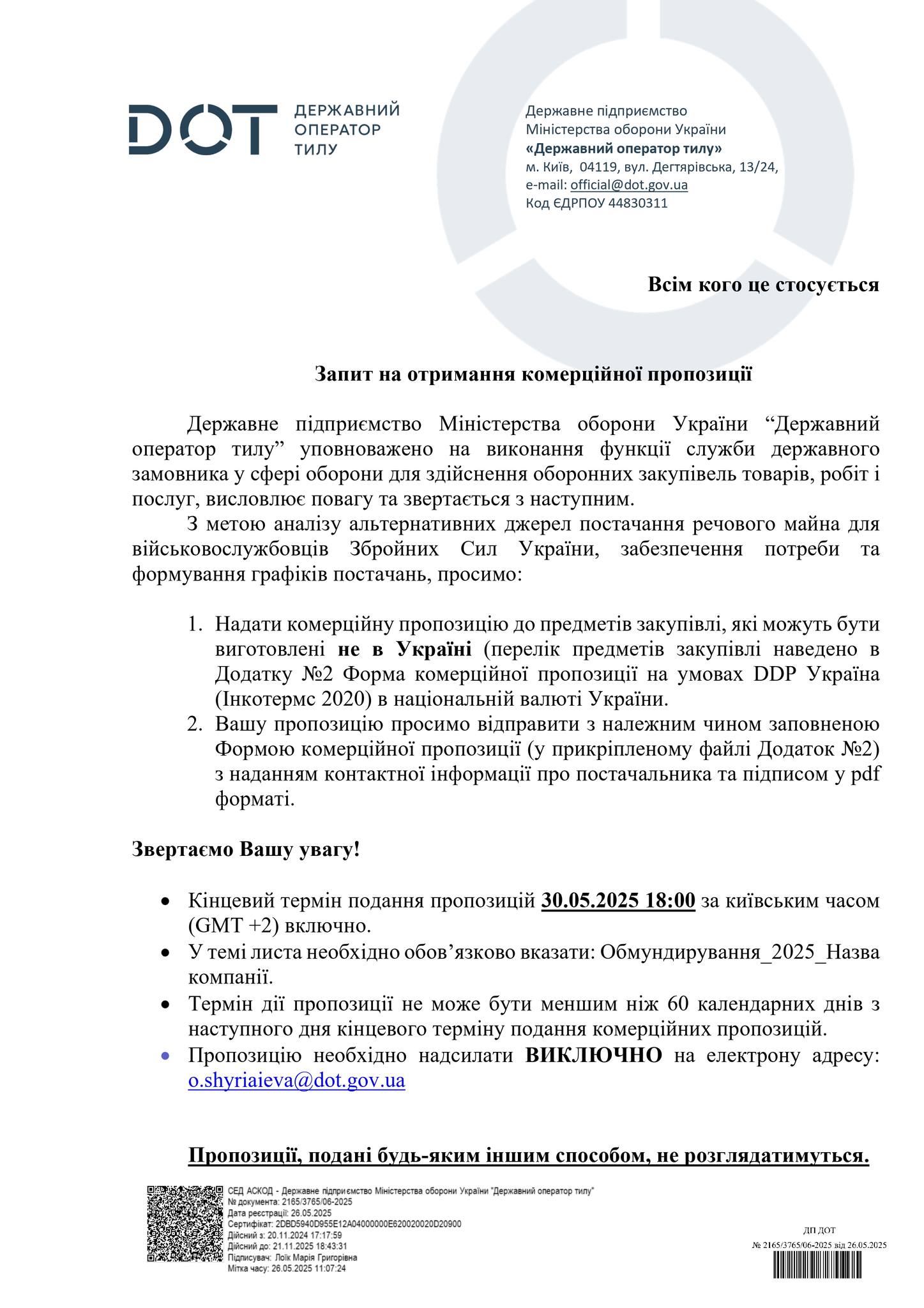 На сайті ДОП оприлюднено відповідний запит на отримання комерційної пропозиції щодо військової форми. На своїй сторінці в Facebook Кисилевський вказав, що це "дуже схоже на держзраду".