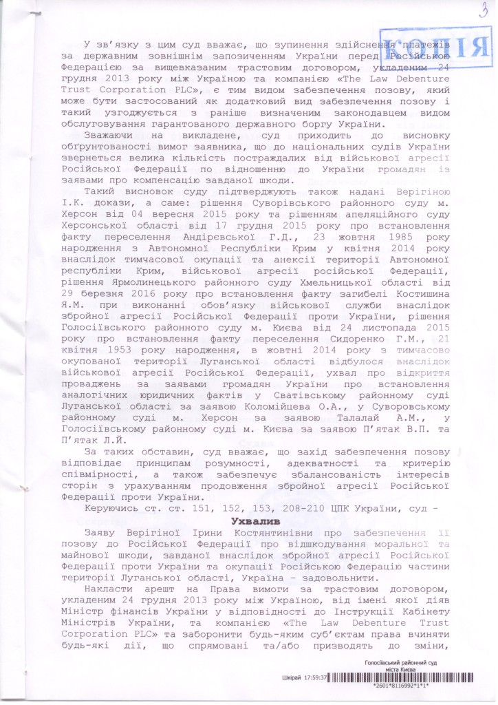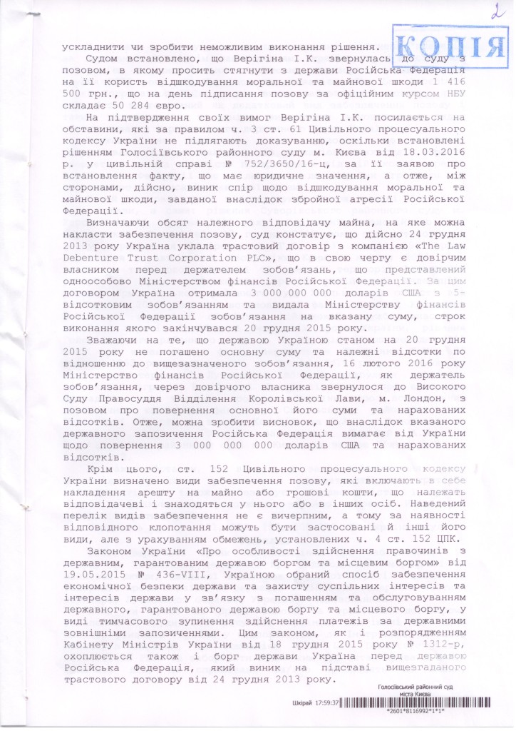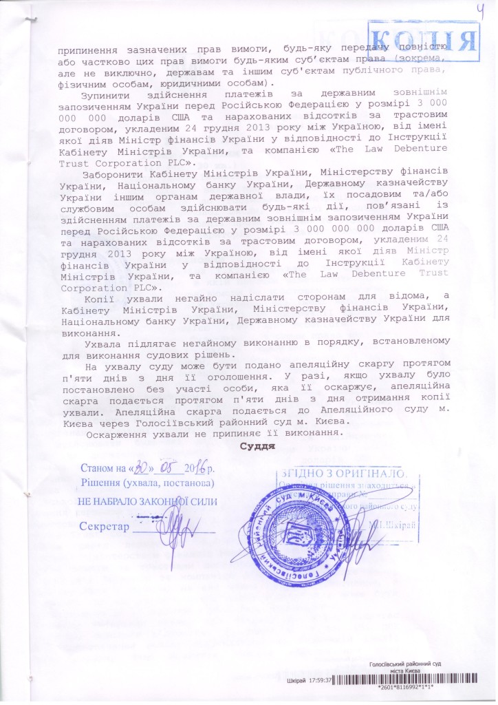 "Припинити здійснення платежів за державним зовнішнім запозиченню України перед Російською Федерацією в розмірі 3 млрд доларів США та нарахованими відсотками за трастового договору, укладеного 24 грудня 2013 року між Україною, від імені якої діяв Міністр фінансів України відповідно до Інструкції Кабінету Міністрів України і компанією "The Law Debenture Trust Corporation PLC"", - йдеться в постанові суду.
