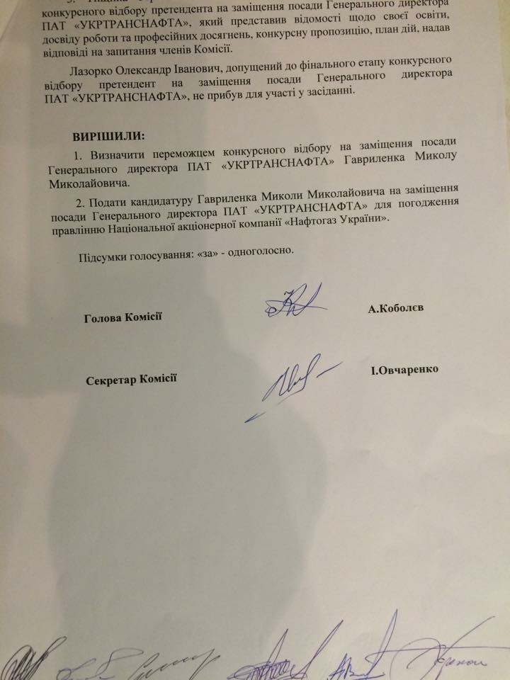 При цьому колишній керівник "Укртранснафти" Олександр Лазорко, який був допущений до фінального етапу конкурсного відбору, не з'явився для участі в засіданні.