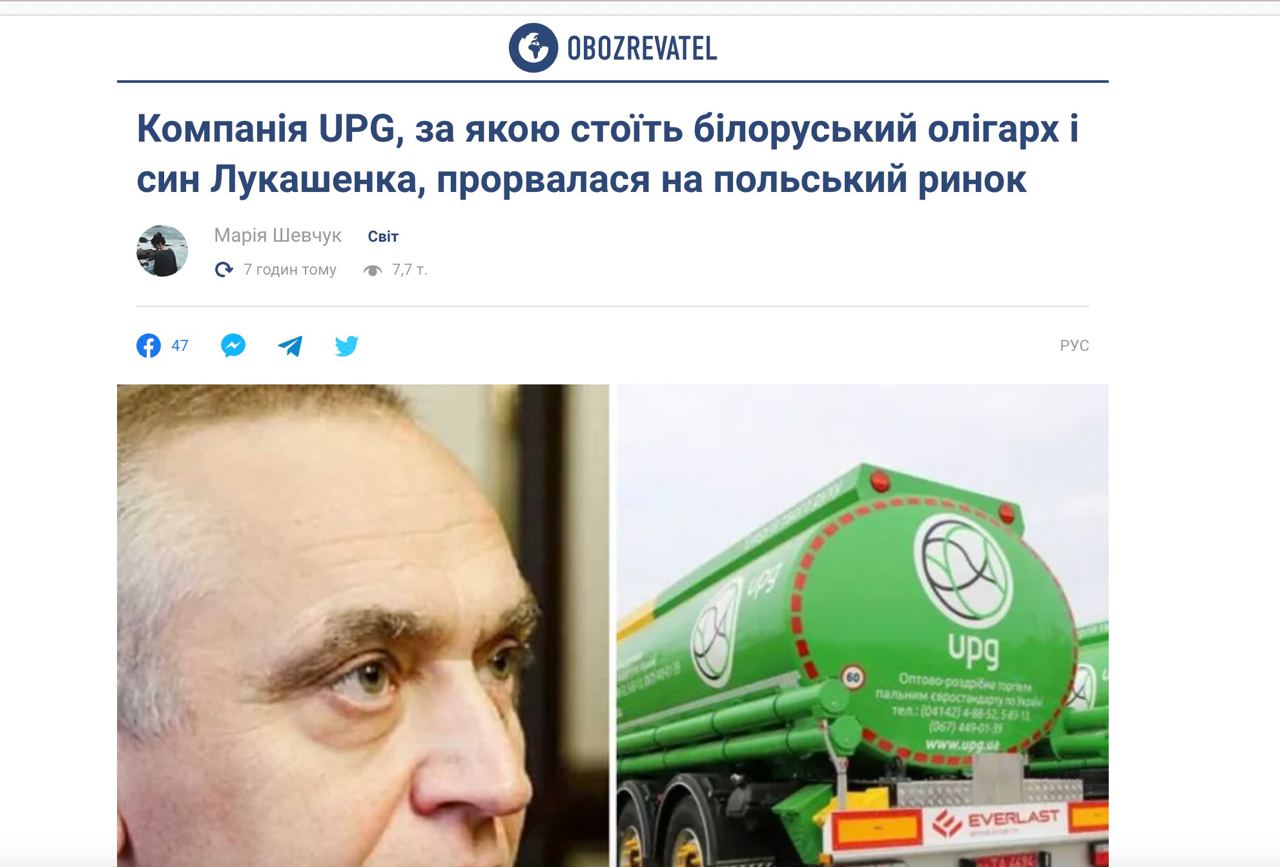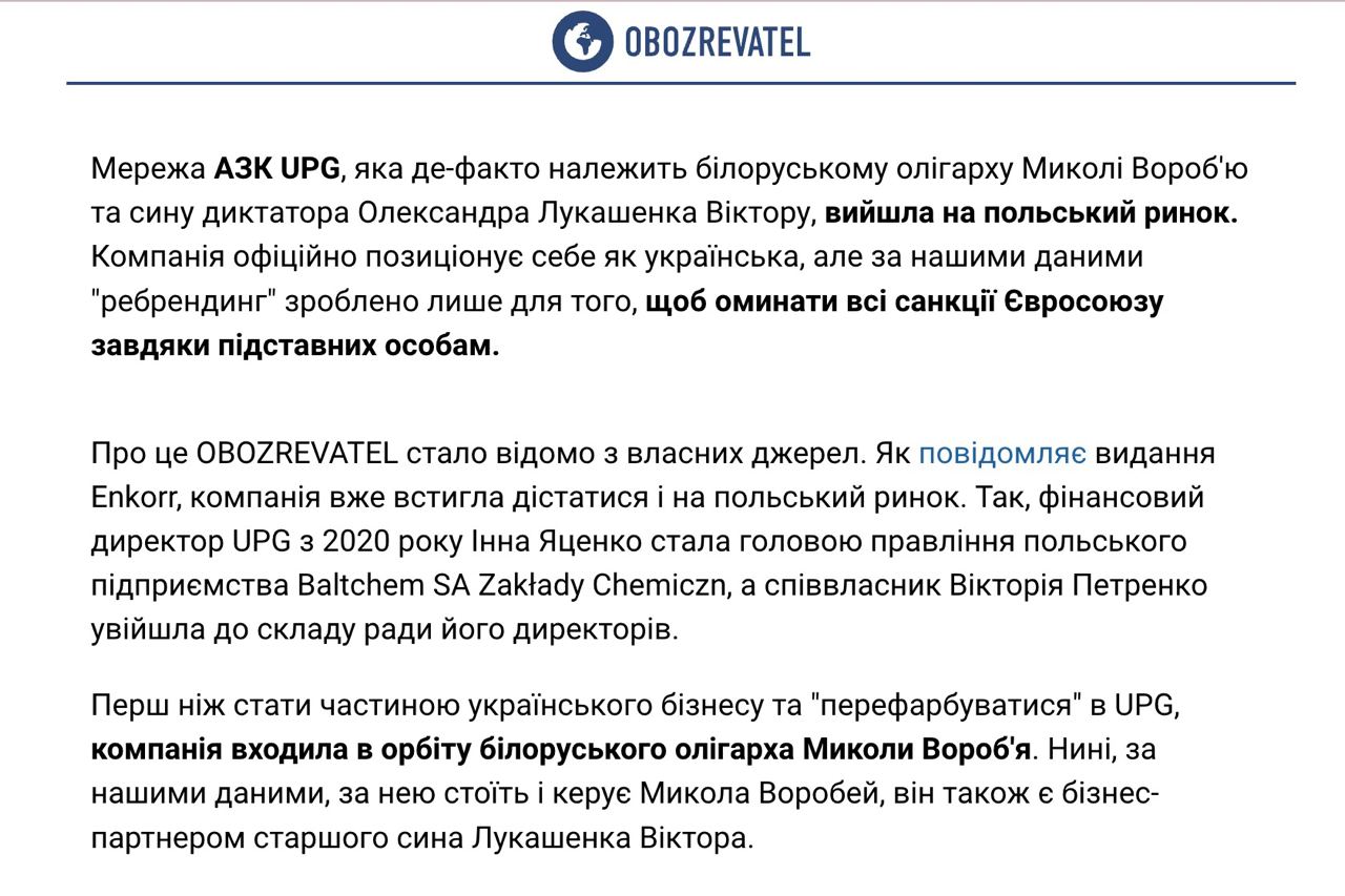 Сьогодні вранці ZN.UA процитувало видання "Обозреватель", повідомивши про те, що одна з найбільших у Польщі мереж АЗС пов'язана із сином Лукашенка та білоруським олігархом Миколою Воробей. Однак потім "Обозреватель" видалив новину із сайту.
