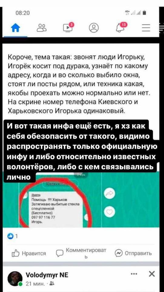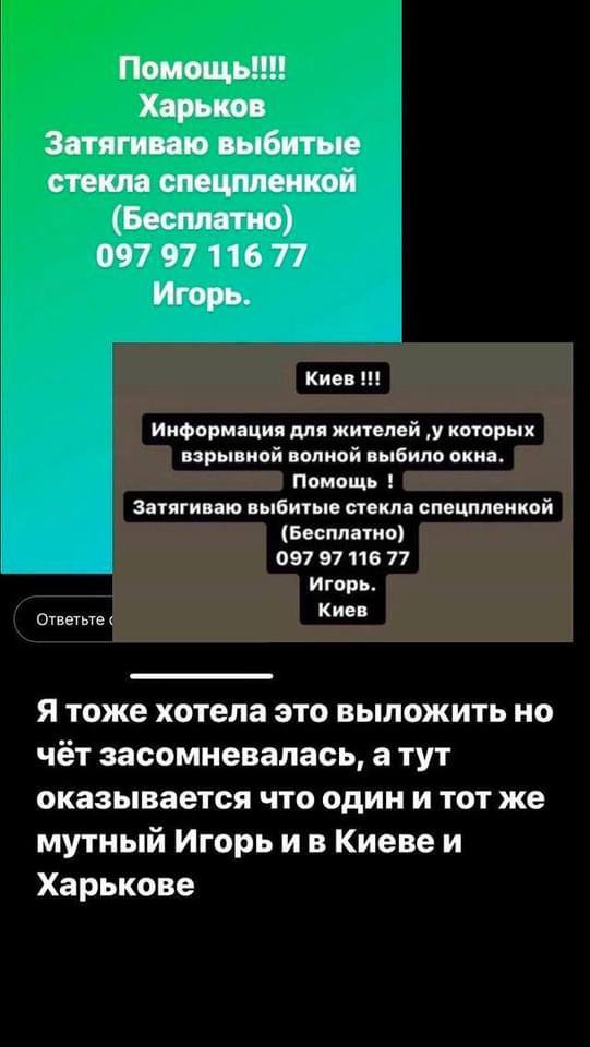 "Важлива інформація! Ворожі коригувальники можуть вдаватися до нових підступів. Якщо ви бачите в соціальних мережах допис про Ігоря чи Івана, якого особисто не знаєте, але він пропонує безплатно допомогти з заміною вибитих шибок, то будьте уважні та перевіряйте інформацію", - йдеться в повідомленні.
