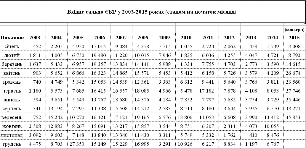 Залишки коштів на єдиному казначейському рахунку уряду до початку вересня 2015 року склали 45,853 млрд грн. Це більш ніж у 3,5 рази (на 32,441 млрд) більше, ніж у минулому році – 13,412 млрд грн у вересні-2014.