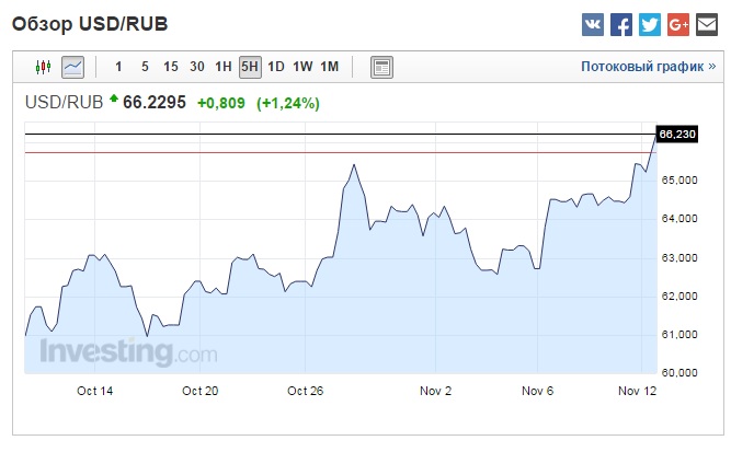 За станом на 15.46 за київським часом долар досягав 66,27 руб./долар, що на 86 копійок вище за рівень попереднього закриття. Курс євро при цьому склав 71,12 руб./євро, додавши 91 копійку.