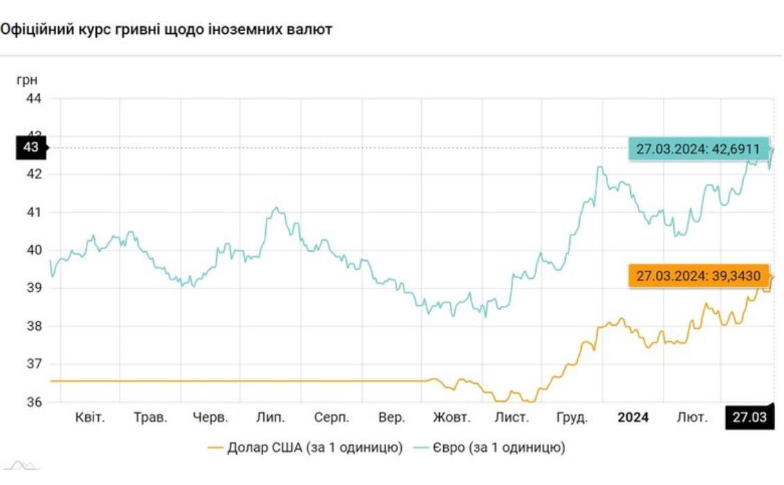 За підсумками торгів на міжбанку Нацбанк встановив офіційний курс гривні до долара на середу, 27 березня, на рівні 39,3430 грн/$, порівняно з 39,2298 грн/$ у вівторок. Тобто курс гривні оновлювив історичний мінімуми щодо долара США.