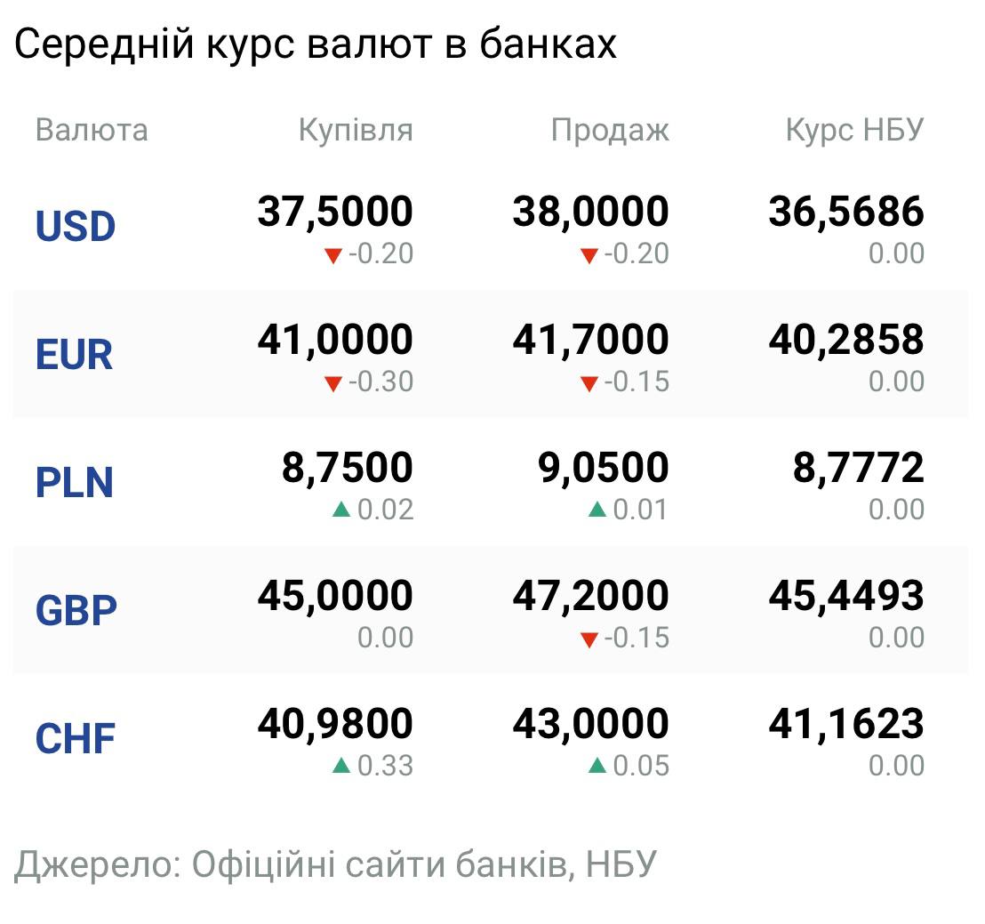 Середній курс купівлі 37,65 грн. Середній курс з продажу 37,75 грн.