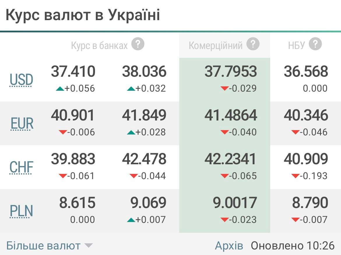 Середній курс купівлі 37,70 грн. Середній курс з продажу 37,80 грн.