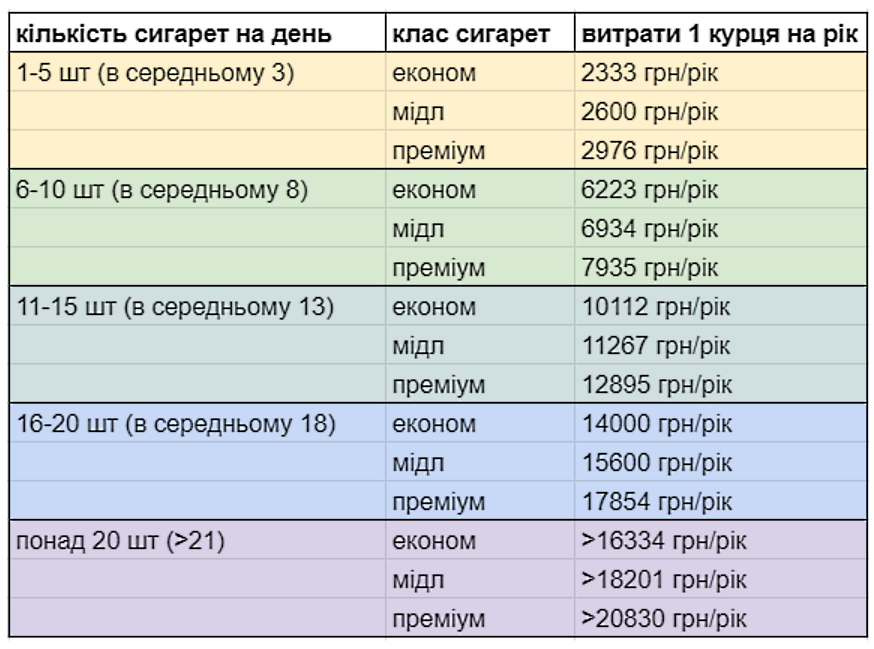 Витрати курців на рік, за умови вживання цигарок економ класу (середня вартість яких у 2019 році становила 42,62 грн), медіум (47,49 грн) та преміум класу (54,35 грн).