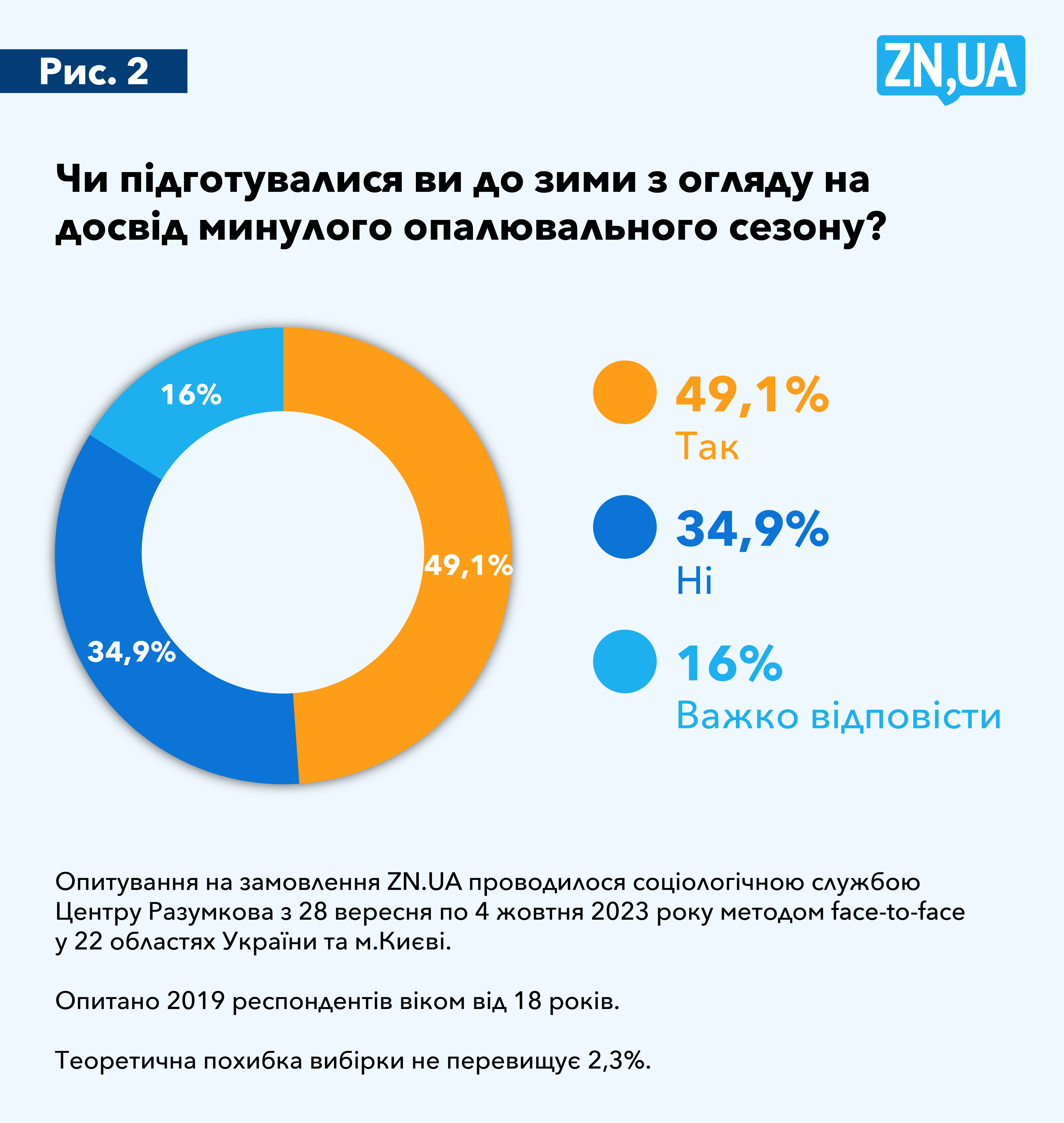 Логічно було б припустити, що це результат досвіду проходження попереднього осінньо-зимового періоду, втім, очікуваної одностайності у відповіді на запитання «Чи підготувалися ви до зими з огляду на досвід минулого опалювального сезону?» ми не побачили (див. рис. 2). Ствердно відповіли тільки 49% опитаних, майже 35% обрали варіант «Ні», ще 16% — варіант «Важко відповісти».